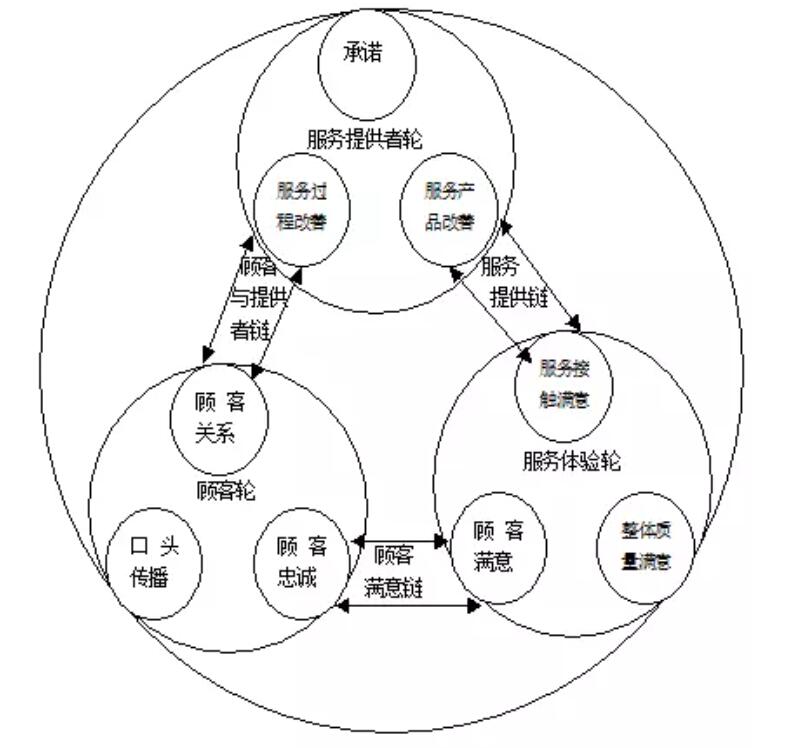 服务提供者轮由“服务承诺”“服务过程”“服务结果”三个基本环节构成,服务承诺高,顾客期望就高,但服务过程与服务结果不到位,期望就会变为失望。服务体验轮由通过服务接触体验,顾客获得满意感,进而推动顾客轮。顾客轮由自身体验、公司的客户关系以及顾客之间的口碑传递三个方面融合决定了顾客的“忠诚度”。